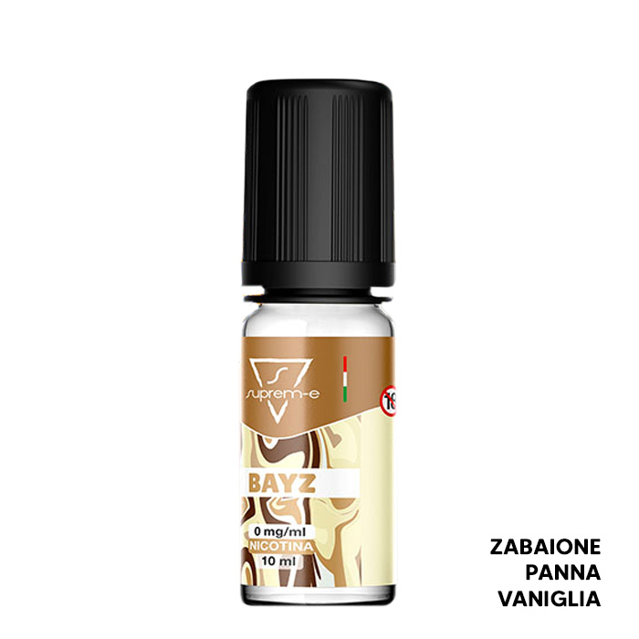Il liquido pronto Bayz del marchio Suprem-e al gusto Zabaione, Panna e Vaniglia può essere usato in atomizzatori a testina, pod mod o in atomizzatori rigenerabili.
