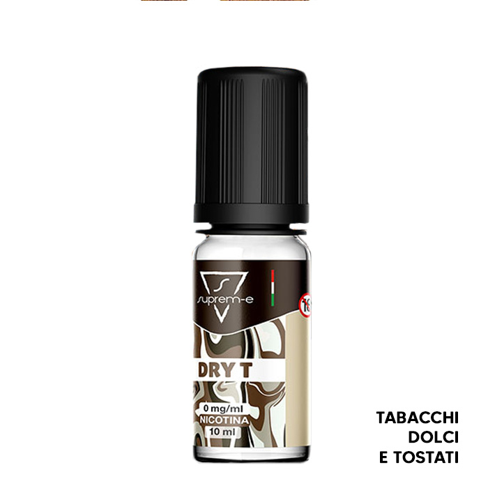 Il liquido pronto Dry T del marchio Suprem-e al gusto Tabacchi Dolci e Tostati può essere usato in atomizzatori a testina, pod mod o in atomizzatori rigenerabili.